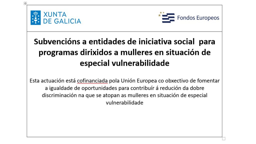 O noso “Programa de Igualdade para as mulleres con discapacidade intelectual de Aspnais”, recibiu unha axuda a través da Dirección Xeral de Promoción da Igualdade. As axudas dos programas de recursos integrais de atención especializada dirixidos a mulleres de especial vulnerabilidade, están cofinanciadas, nun 60% pola Unión Europea no marco do programa FSE+ Galicia 2021-2027, no obxectivo político 4. Unha Europa máis social e inclusiva, por medio da aplicación do piar europeo de dereitos sociais; prioridade 2: Inclusión social e loita contra a pobreza; obxectivo específico 4.8: Fomentar a inclusión activa co obxecto de promover a igualdade de oportunidades, a non discriminación e a participación activa, e mellorar a empregabilidade, en particular para os grupos desfavorecidos; medida 2.H. 03 – Programa de atención a mulleres en situación de especial vulnerabilidade.