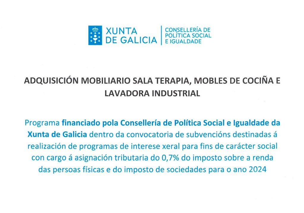 Este ano 2025 compramos mobiliario para a sala de terapia, novos mobles de cociña e unha lavadora industrial para o taller ocupacional de lavanderia, grazas o programa financiado pola Consellería de Política Social e Igualdade da Xunta de Galicia dentro da convocatoria de subvencións destinadas á realización de programas de interese xeral para fins de carácter social con cargo á asignación tributaria do 0,7% do imposto sobre a renda das persoas físicas e do imposto de sociedades para o ano 2024